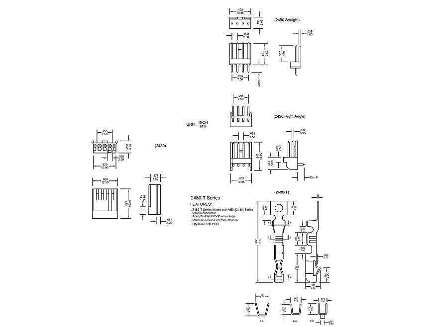 * 2480 Series mates mith .025"[0.64mm] pins accepts