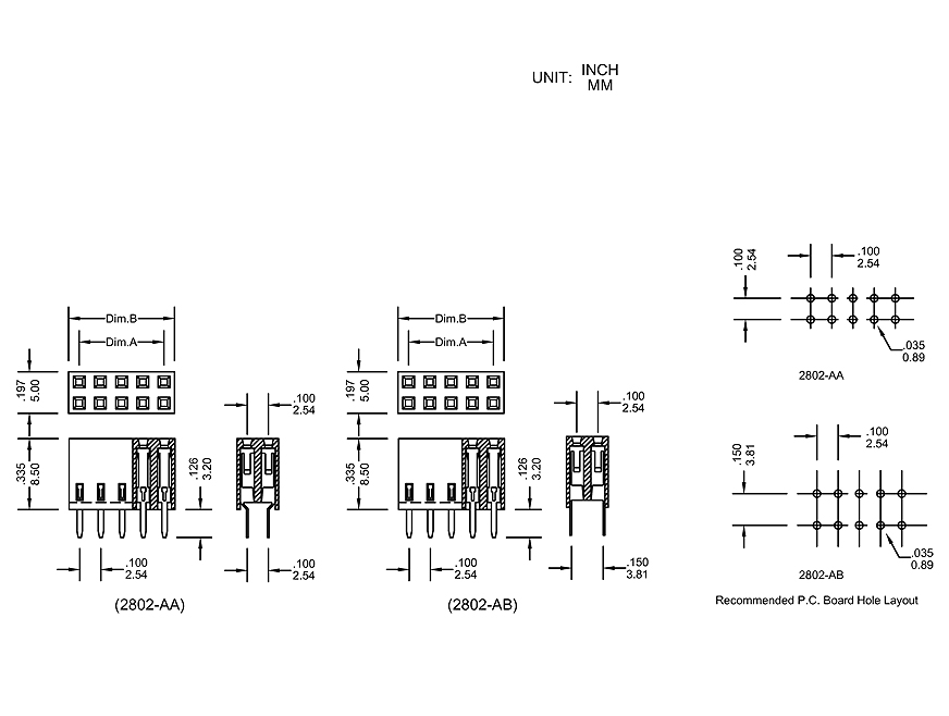 2802-AA Series .100" (2.54mm) Grid P.C. Tails .100" (2.54mm) Grid Mating End