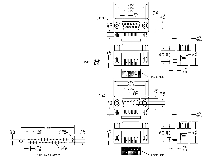 * Contact positions: 09,15,25 and 37 plug a ferrite plate, as