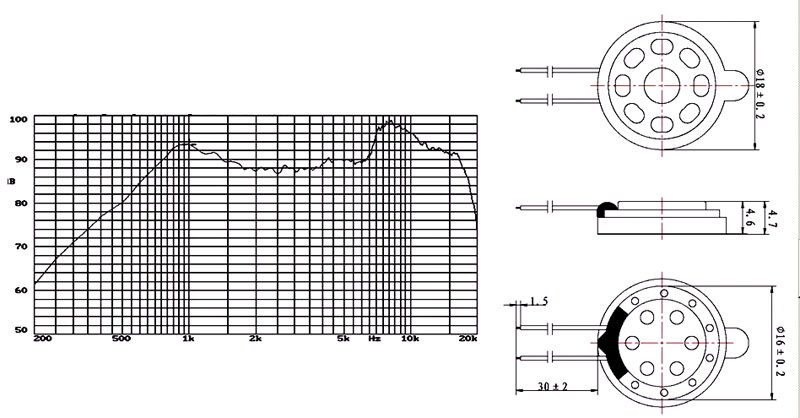 • Sound Pressure level: 90±3dB@0.1W10cm( at 1.0 , 1.2 , 1.5 , 2.0KHz in average)