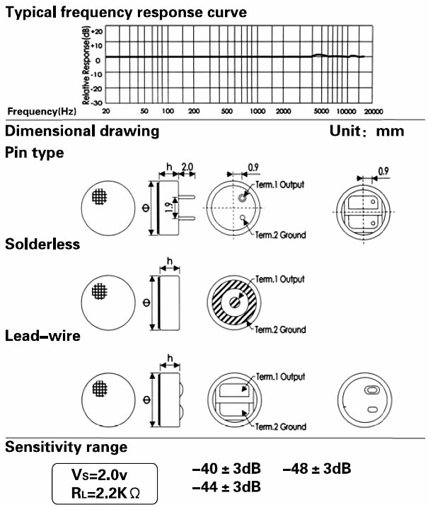 - Sensitivity: See above(0dB = 1v / Pa, 1kHz)