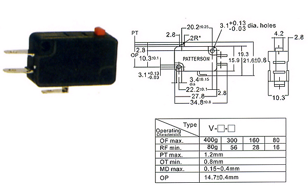 Other Industry Electronic Components Micro/miniature switches V-□-□ Pin Plunger Type Description Unless otherwise specified, a tolerance of ±0.4mm applies to all dimensions Add to Inquiry Delete Review Inquiry List Supplier Information Patterson Enterprises Co., Ltd. TEL : 886-3-360-2345 FAX : 886-3-360-6689 No. 19, Sho Shing St.; Wenjung Li Taoyuan, Taiwan, R.o.c.(33056) Web-Site : http://www.patterson.com.tw/ E-Mail : paterson@ms12.hinet.net